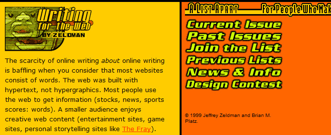 It seems this isn’t the earliest article on ALA, but it is “Issue 1.01″ so I think that’s good enough. This post has everything. A crazy 90s design, content broken into multiple pages, and the whole thing sits on a wonderfully ancient set of HTML frames. But hey, at least it has a doctype.